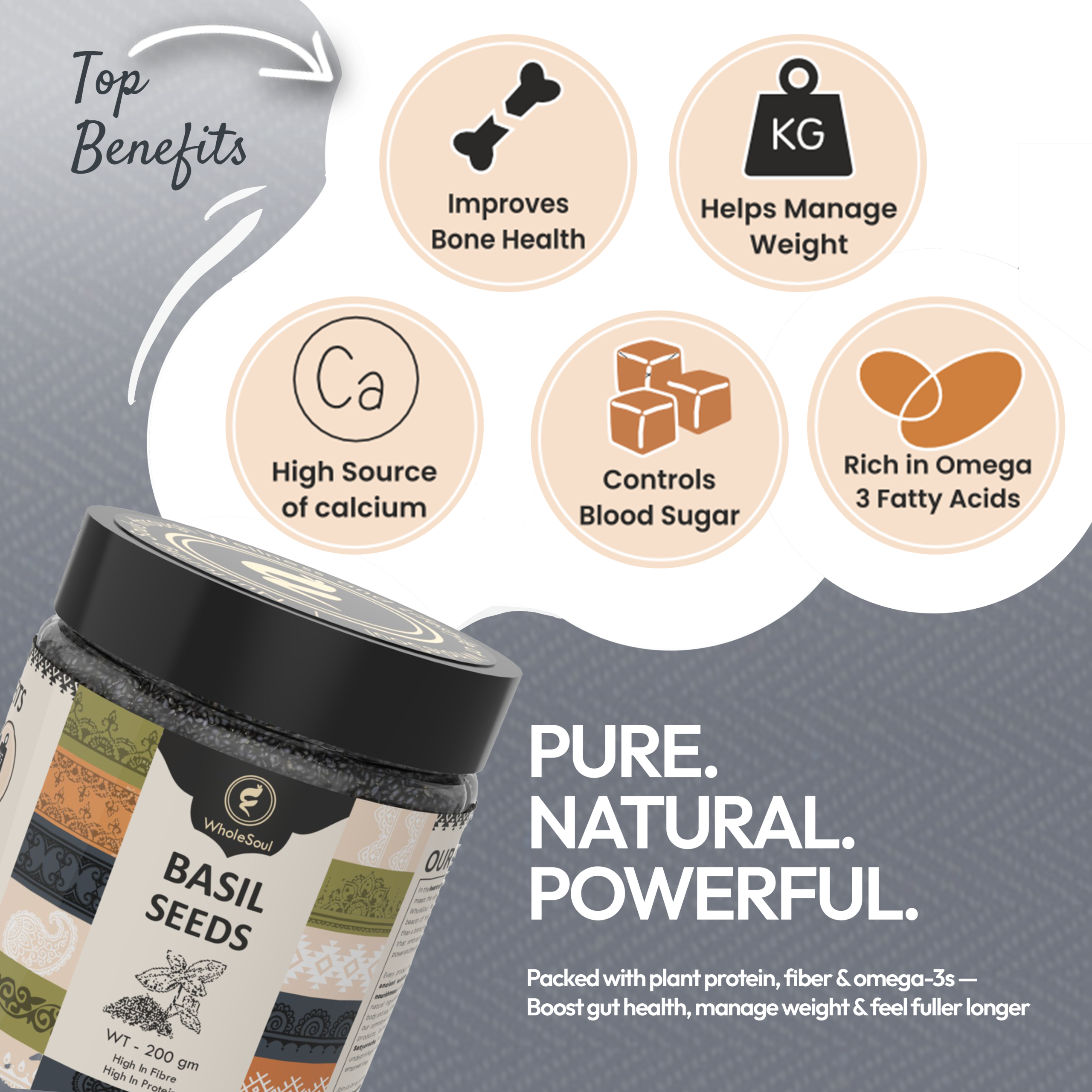 Rich in dietary fiber, they promote a feeling of fullness, making them ideal for weight management. Basil seeds also help regulate blood sugar, ease acidity, and improve gut health by acting as a natural prebiotic. When soaked, they develop a gelatinous texture that soothes the digestive tract and cools the body from within.